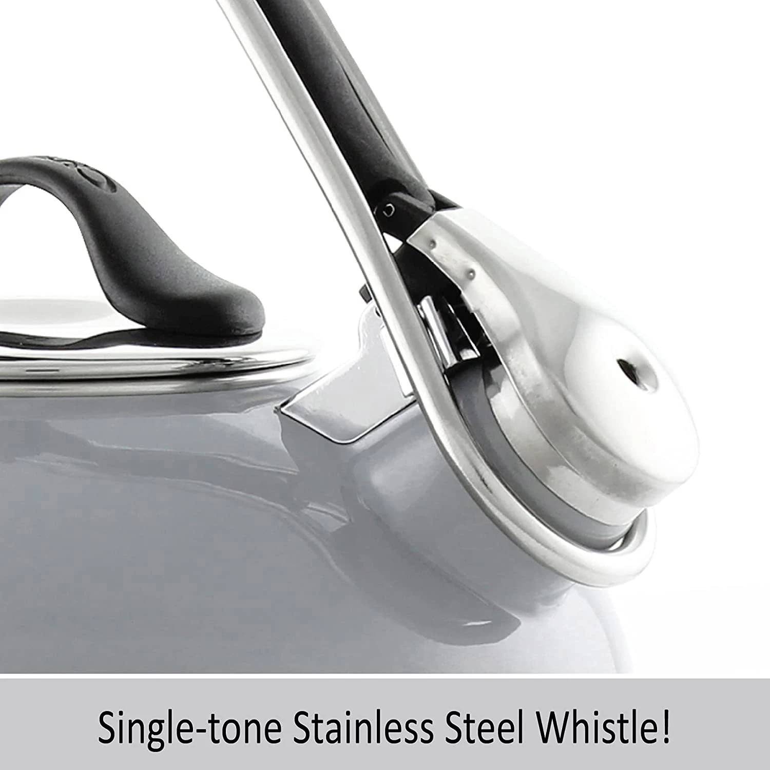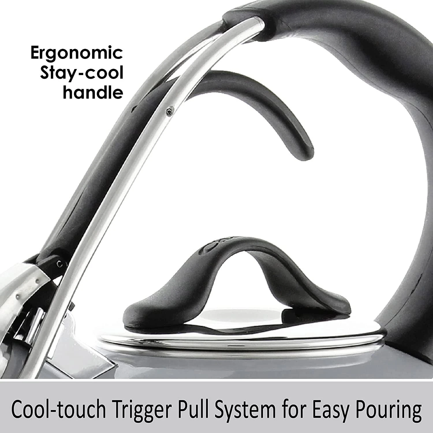 - DESIGN & FUNCTION: Elegant, contemporary design and ingenious functionality; Design Journal ADEX Platinum Award Winning Teakettle!; Ergonomic cool-touch handle; Durable stainless steel single-tone whistle