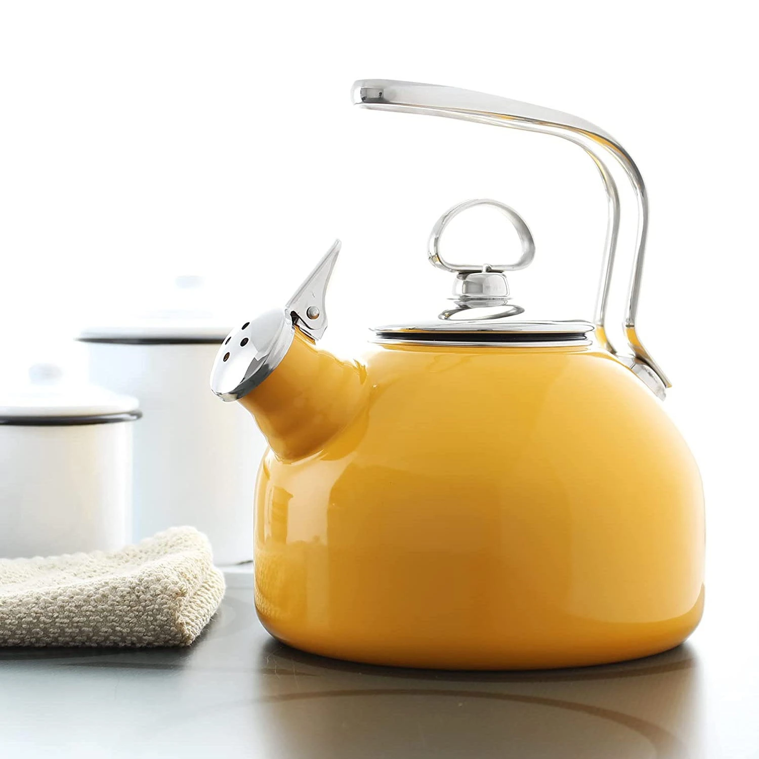 Chantal classic teakettle rocketed to popularity when introduced 30-years ago. The accolades continue for this timeless Chantal original, sure to remain a design icon and home favorite for the foreseeable future. This kettle is part of Chantal classic Series which includes the finest Teakettles from our collection. Each design offers incomparable elegance and is designed for exceptional use. Featuring our exclusive two-tone Harmonica whistle, this kettle doesn’t just whistle it sings. The smooth, flat base creates maximum contact for rapid boiling, and the extra-large opening allows for easy cleaning and handling. Enamel-on-steel Teakettles are made with magnetic carbon steel which means they will work on all cooktop including magnetic induction. Enamel is also easy to clean and the color will not fade over time.