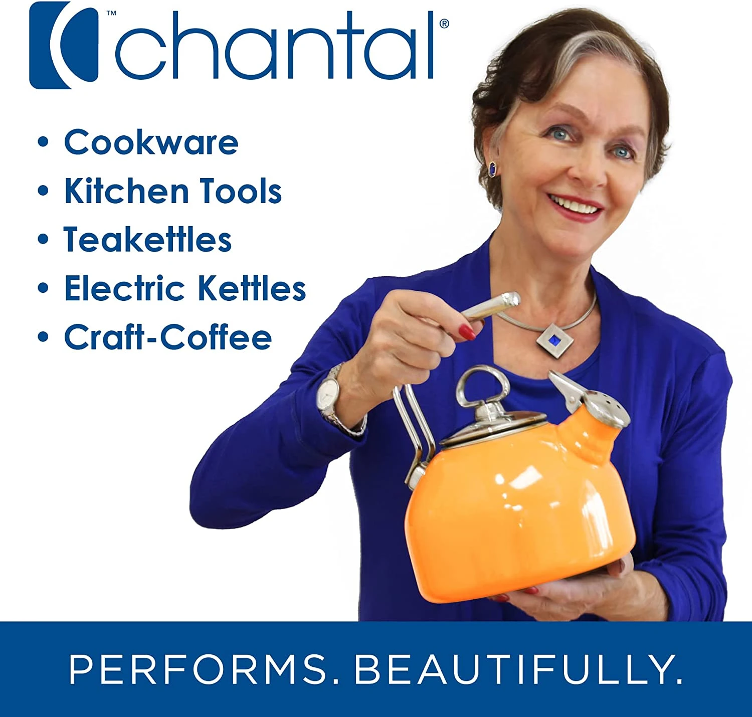 - FROM CHANTAL: 50 years ago, Chantal was the first to bring dramatic color, tempered glass lids, stay-cool handles and teakettles with a harmonica whistle to the kitchenware marketplace and continues to dedicate itself to the creation of innovative products that bring elegance to the home. Performs. Beautifully.
