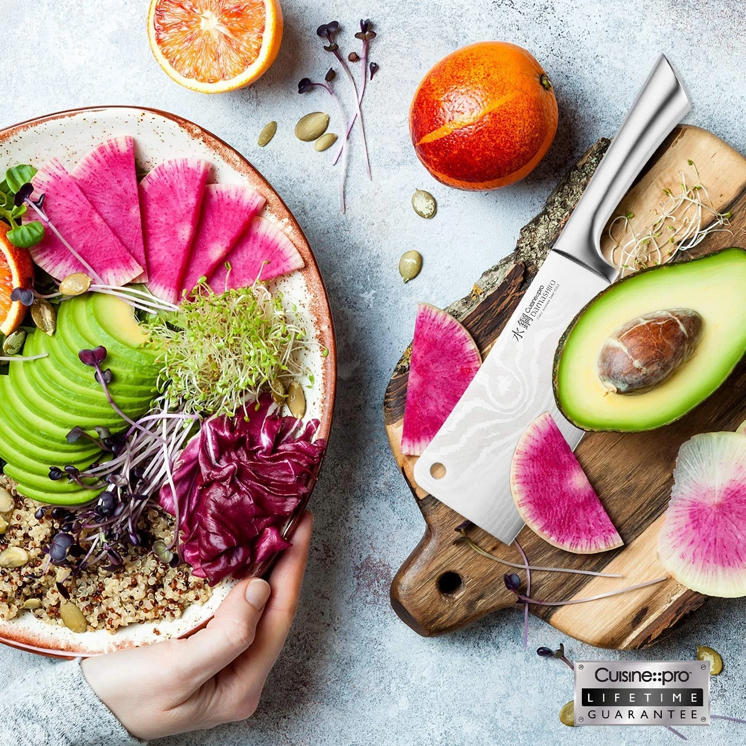 The Cuisine::pro Damashiro Cleaver 6.7″ is designed for portioning poultry, larger cuts, and small cuts of meat. It has been engineered to be weighted making chopping through bone and joint cutting faster. The high-quality blade has been tapered to allow for a thinner and more precise cutting edge. Engineered and tested to meet Rockwell 53 specifications for the blade hardness and optimum performance.