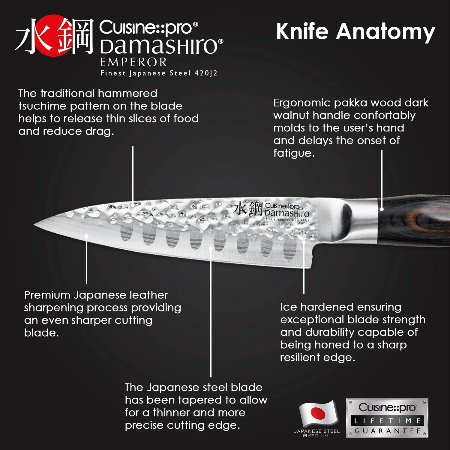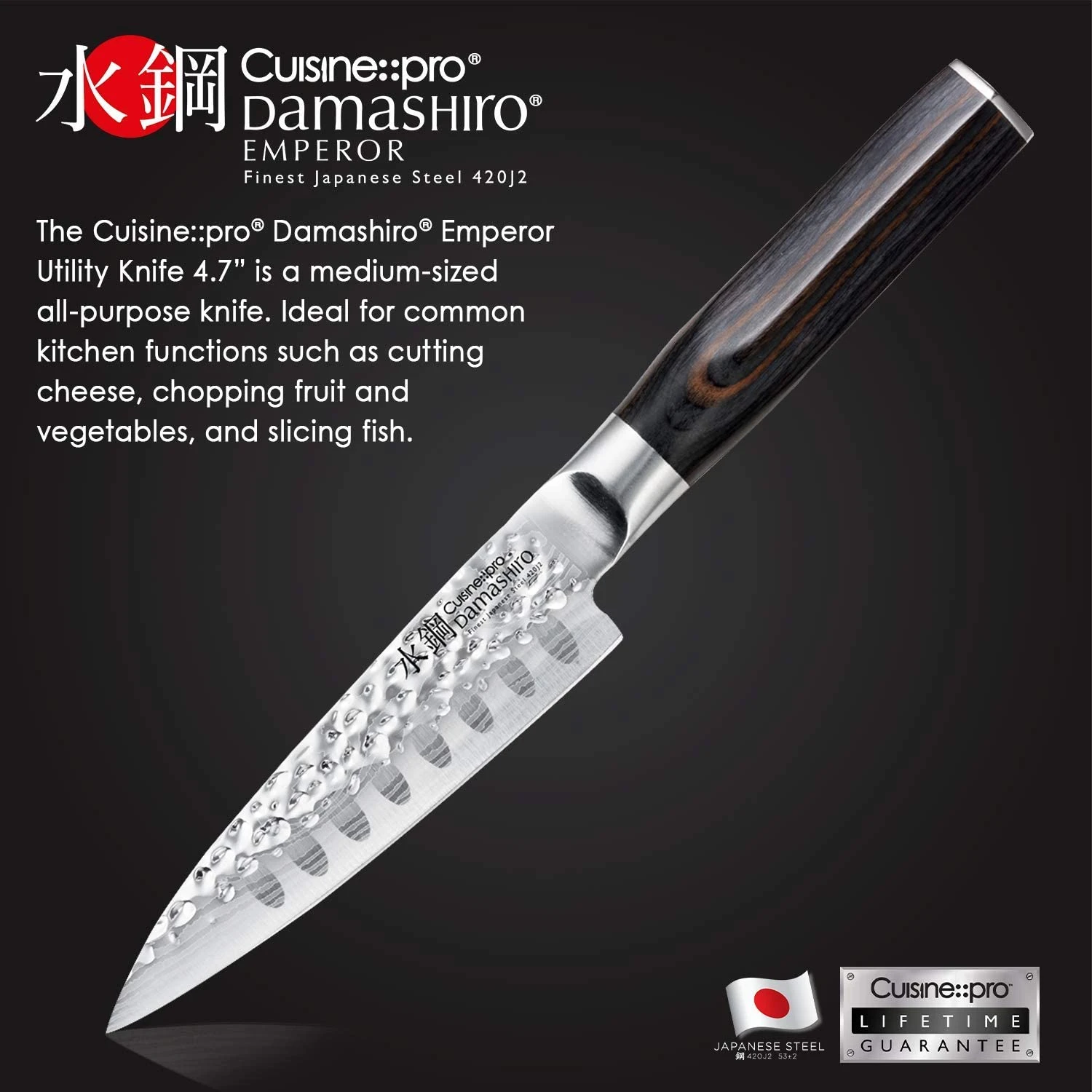 - Cuisine::pro Damashiro Emperor Japanese knives are made from the finest quality Japanese steel. Inspired by traditional Japanese craftsman and Samurai sword makers, these knives are characterized by distinctive Damascus inspired patterns on the blade of banding and mottling reminiscent of flowing water. Damashiro blades are made from specialist ice hardened Japanese steel which makes them super tough, resistant to shattering and capable of being honed to a sharp, resilient edge.
