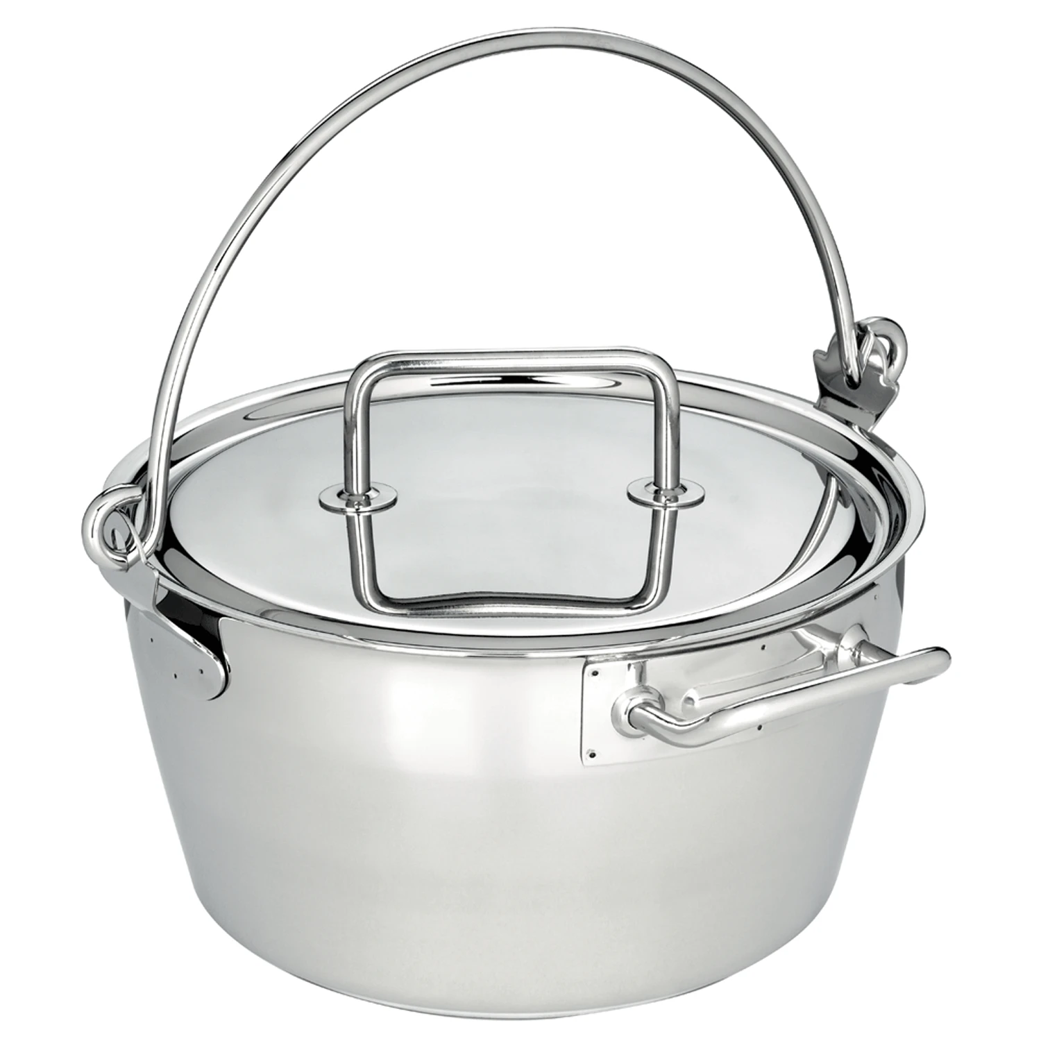 This large pot with special handle and perfect pouring edge is ideal for mussel preparations. This maslin pan is delivered with a stainless steel lid and is suitable for all cookers, including induction.