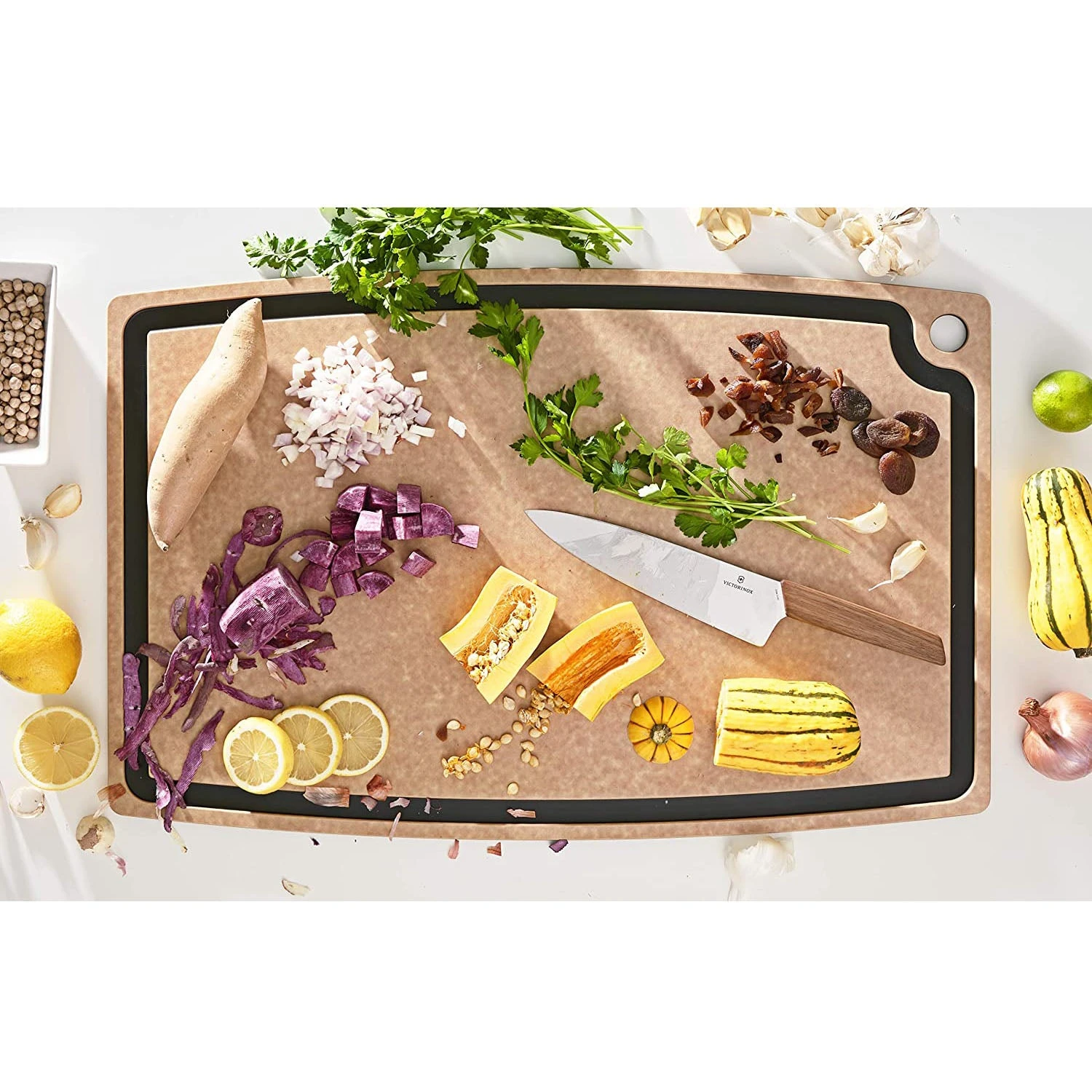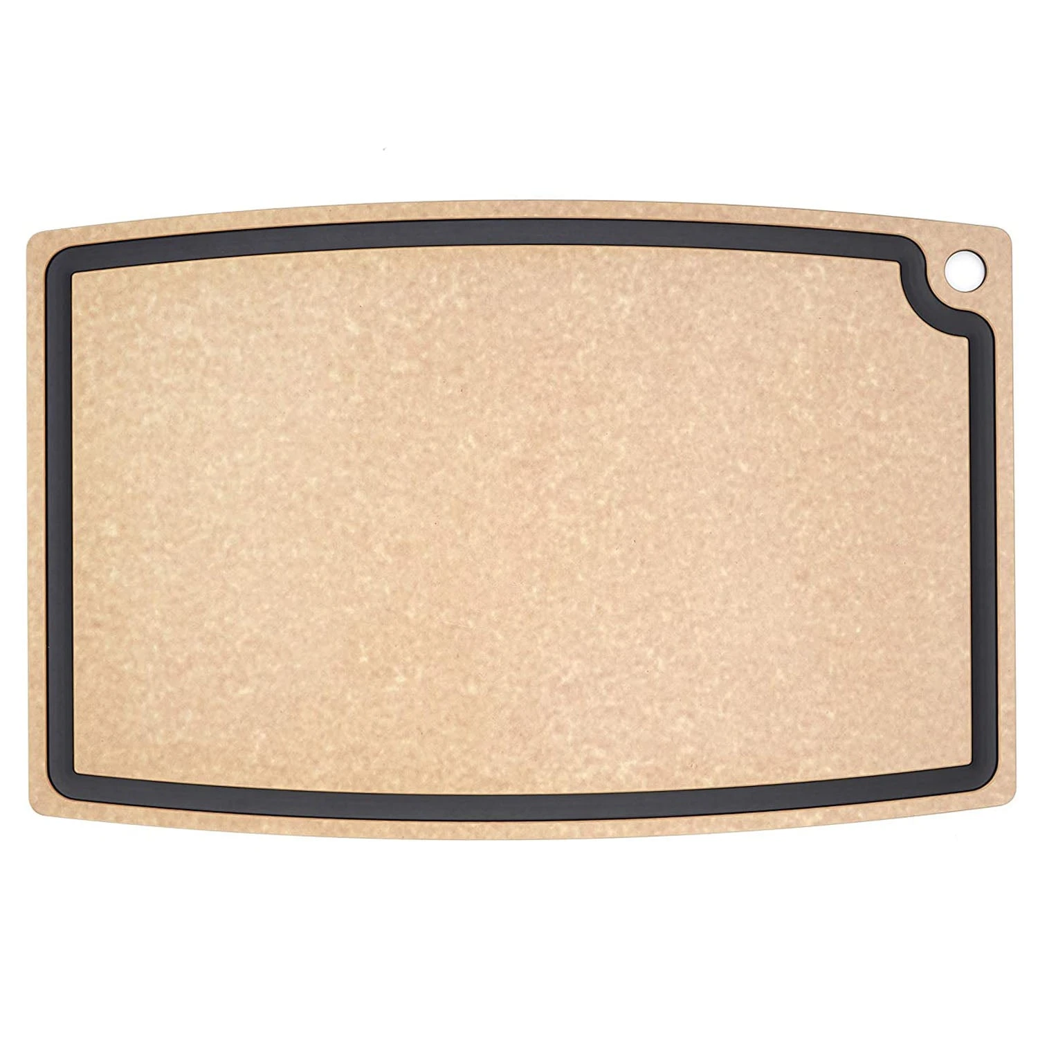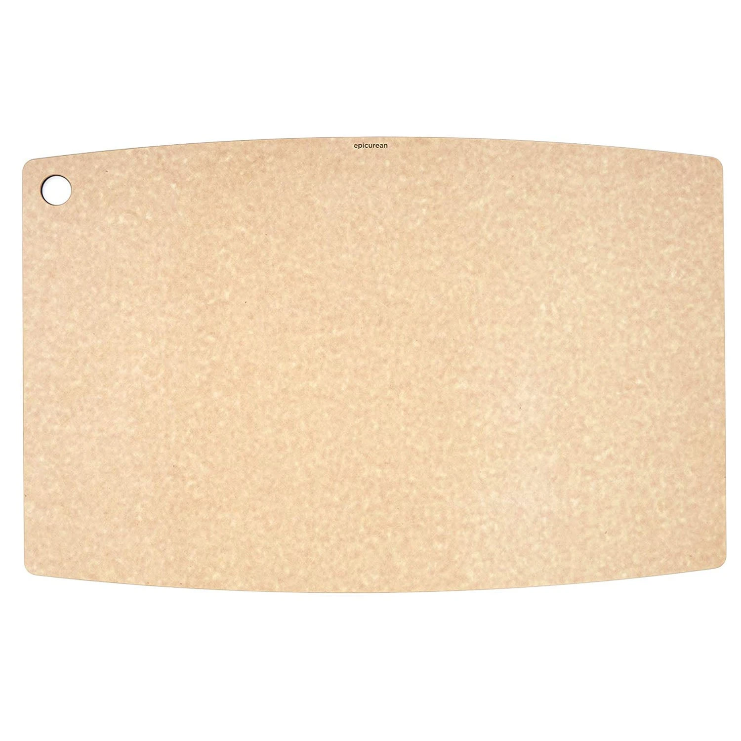 Epicurean is a way of life-a reflection of our personal values and those of our customers. Every Epicurean cutting board and kitchen accessory is made with naturally renewable materials in an environmentally responsible way. Our products are well-designed, practical, casual tools that feel at home in any kitchen. Today, Epicurean cutting boards, kitchen tools and utensils are at the center of everyday life for both the casual cooks and seasoned gourmets. We pride ourselves on original designs that are simple, functional and beyond trend. Every Epicurean product is made in the U. S. A., creating good jobs and strengthening the economy. Our cutting boards and tools get their natural look and texture from our exclusive material called Richlite, a paper composite which is non-porous, dishwasher safe, durable and easy on knives. It has been used in commercial kitchen and restaurants for over 75 years and meets the highest standards of cooks and chefs worldwide. The Epicurean Gourmet Series cutting boards feature a thicker profile board-3/8”. Each cutting board in the Gourmet Series features “juice groove” on one side to capture liquids and keep countertops clean, and a flat side when the juice groove isn’t needed. The multi-functional surface won’t dull knives; is heat-resistant to 350 degrees F, which means hot pans can be place on it without leaving a brown ring; requires no oiling; and is dishwasher-safe. Both the top and bottom surfaces may be used for cutting meat, chopping onions, slicing bread, and more-the natural finish will darken with use. This series is available in 4 sizes and 3 color combinations.