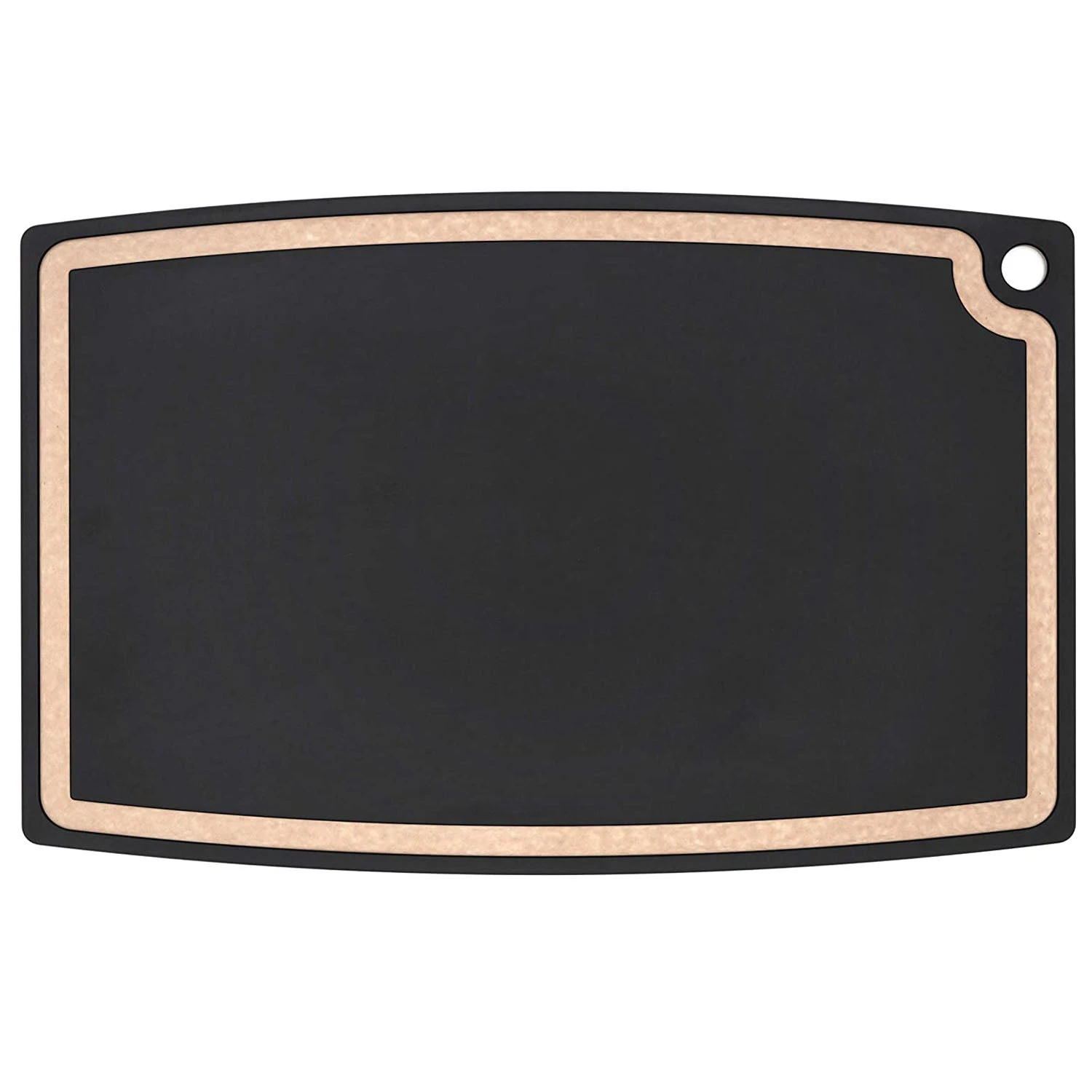 Epicurean is a way of life-a reflection of our personal values and those of our customers. Every Epicurean cutting board and kitchen accessory is made with naturally renewable materials in an environmentally responsible way. Our products are well-designed, practical, casual tools that feel at home in any kitchen. Today, Epicurean cutting boards, kitchen tools and utensils are at the center of everyday life for both the casual cooks and seasoned gourmets. We pride ourselves on original designs that are simple, functional and beyond trend. Every Epicurean product is made in the U. S. A., creating good jobs and strengthening the economy. Our cutting boards and tools get their natural look and texture from our exclusive material called Richlite, a paper composite which is non-porous, dishwasher safe, durable and easy on knives. It has been used in commercial kitchen and restaurants for over 75 years and meets the highest standards of cooks and chefs worldwide. The Epicurean Gourmet Series cutting boards feature a thicker profile board-3/8”. Each cutting board in the Gourmet Series features “juice groove” on one side to capture liquids and keep countertops clean, and a flat side when the juice groove isn’t needed. The multi-functional surface won’t dull knives; is heat-resistant to 350 degrees F, which means hot pans can be place on it without leaving a brown ring; requires no oiling; and is dishwasher-safe. Both the top and bottom surfaces may be used for cutting meat, chopping onions, slicing bread, and more-the natural finish will darken with use. This series is available in 4 sizes and 3 color combinations.
