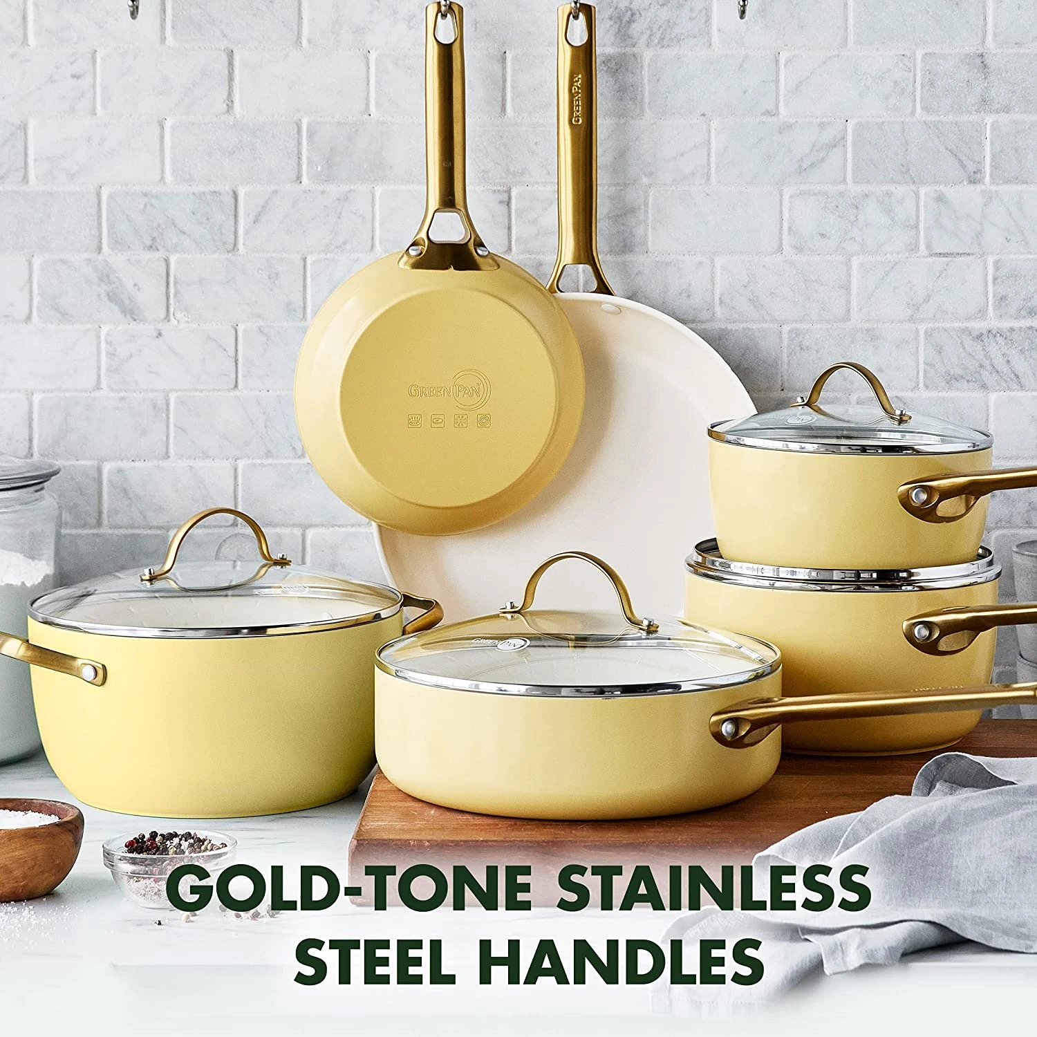 World-class performance meets minimalist chic in the GreenPan Padova collection. These eye-catching blush pans are designed to stay beautiful— the collection’s Duoforged hard anodized aluminum construction makes each of the pots and pans extra tough and scratch-resistant while also promoting even heat distribution for consistent cooking. Each pan features our Thermolon healthy ceramic nonstick coating, reinforced with diamonds to make it ultra-durable and heat responsive. Our ceramic nonstick coating helps you make any meal healthier because it’s free of PFAS, PFOA, lead, and cadmium and will never release toxic fumes, even when overheated. Durable glass lids give you an easy view of your meals and the matte stainless steel handles make each pan easy to take from the stovetop to the oven. Dishwasher safe. Oven safe up to 600°F. This cookware set includes 8” and 11” frypans, 2QT saucepan with lid, 3QT casserole with lid, 2.5QT skillet with lid, and 5QT stockpot with lid. Limited lifetime warranty.