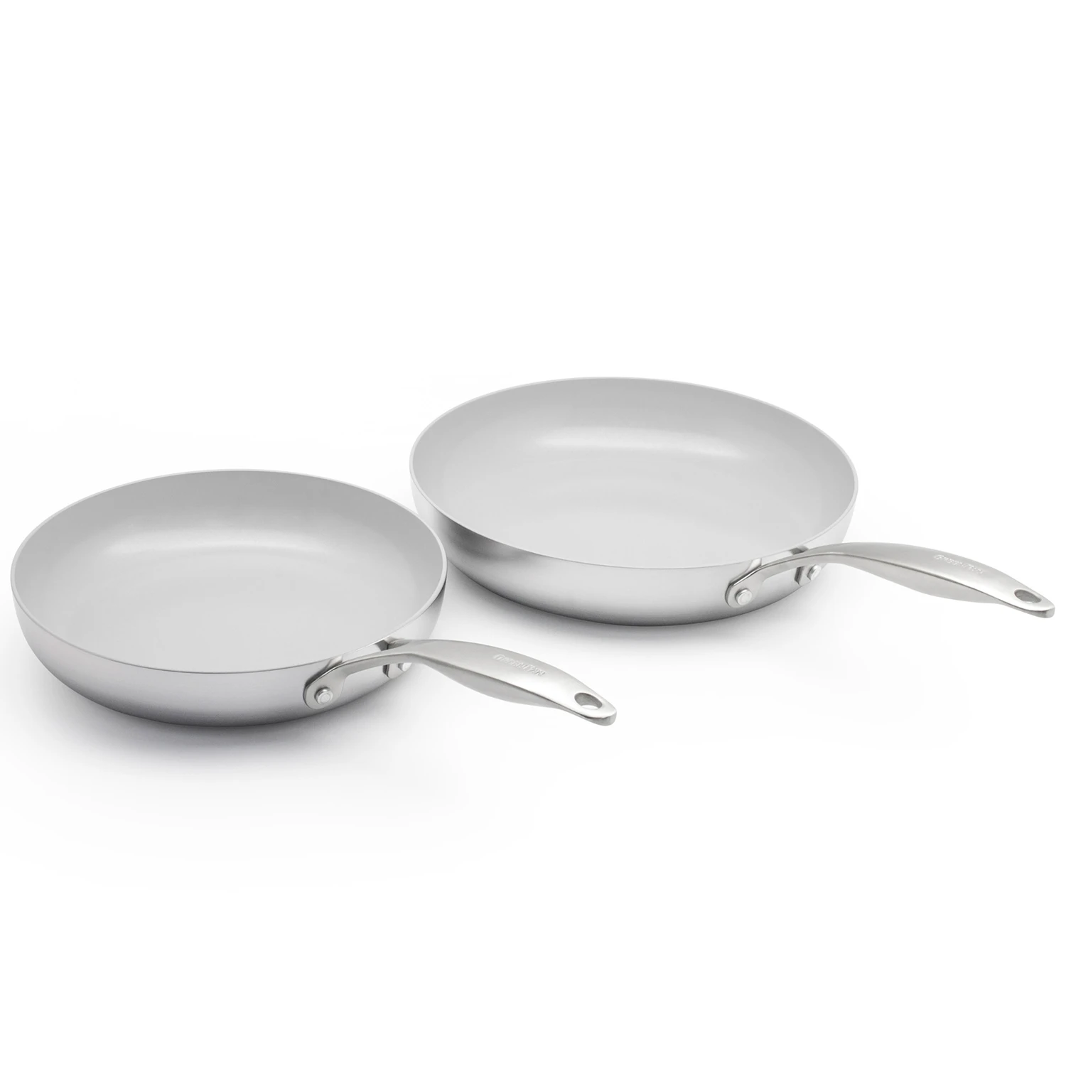 Looking for extra durable cookware with a timeless design, perfect for everyday use? Our GreenPan Venice Pro frypans are an eternal favorite. The multilayer stainless steel body is stylish, handy, and suitable for all cooking surfaces including induction and enforced with Evershine technology, applied to the exterior body of your cookware to avoid discoloration and keep your stainless steel looking new. The interior is coated with Thermolon Minerals Pro, now metal utensil safe and lasts even in the face of intense use and cleaning. Impressed? Wait until you see the trimmed edges to keep your Venice flawless, the riveted stainless steel side handles that allow your cookware to quickly go into the oven and glass lids that are designed for easy food monitoring without losing the heat.