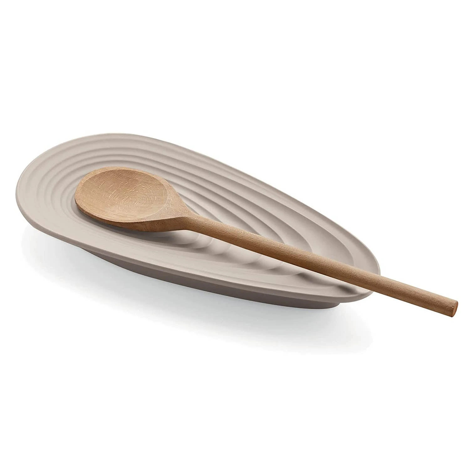 Spoon rest, made by recycling 5.6 100% post-consumer plastic water bottles, small but also essential for keeping the kitchen worktop clean. Designed to take even large cutlery and ladles, its ample base ensures excellent stability. Dishwasher-safe.