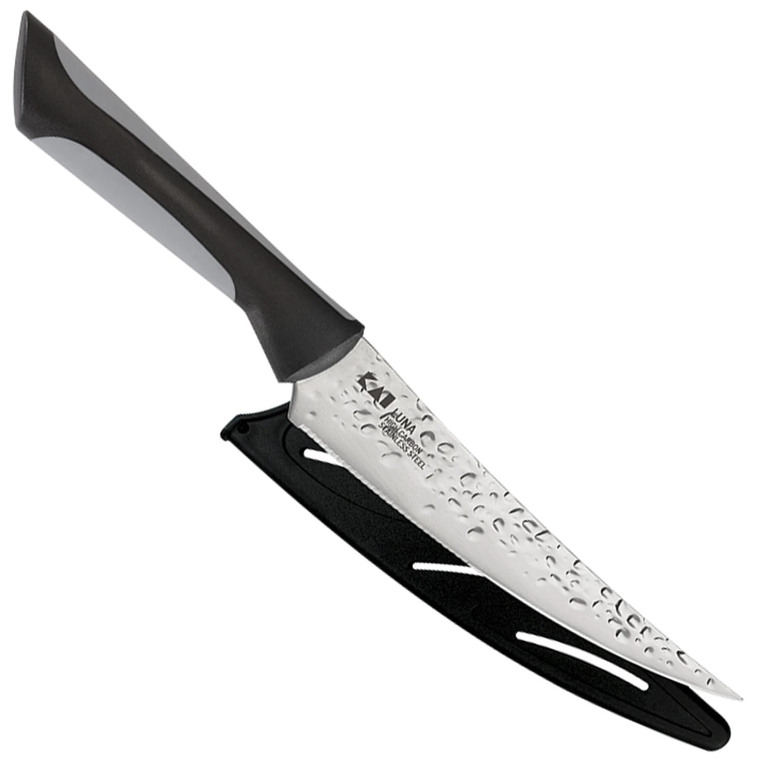 The Kai Luna series offers exciting style and performance at a value price. With its unique hammered finish, it offers eye-catching good looks. But Luna also gives you top cutting performance. Its high-carbon stainless steel blade has been expertly hardened for exceptional edge retention, strength, and rigidity. Mirror polish on the upper part of the blade and a graze finish on the lower part add beauty as well as enhancing stain and corrosion resistance. The edge is hand sharpened and finished to a razor-sharp 16° cutting edge each side. Luna’s quality steel is easily the equal of much higher-priced competitors. For comfortable cutting, Luna’s handles offer lightweight maneuverability and reduced cutting fatigue. Soft-grip overlays on the top and bottom of the handle provide a secure grip. From its beautiful blade finish and razor-sharp edge to its contemporary styling, Kai’s Luna series provides the performance good cooks demand at a price that even aspiring cooks can afford. A matching storage sheath is included with each piece of Luna kitchen cutlery.