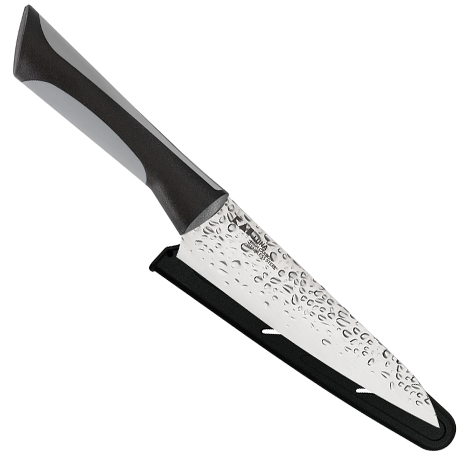 The Kai Luna series offers exciting style and performance at a value price. With its unique hammered finish, it offers eye-catching good looks. But Luna also gives you top cutting performance. Its high-carbon stainless steel blade has been expertly hardened for exceptional edge retention, strength, and rigidity. Mirror polish on the upper part of the blade and a graze finish on the lower part add beauty as well as enhancing stain and corrosion resistance. The edge is hand sharpened and finished to a razor-sharp 16° cutting edge each side. Luna’s quality steel is easily the equal of much higher-priced competitors. For comfortable cutting, Luna’s handles offer lightweight maneuverability and reduced cutting fatigue. Soft-grip overlays on the top and bottom of the handle provide a secure grip. From its beautiful blade finish and razor-sharp edge to its contemporary styling, Kai’s Luna series provides the performance good cooks demand at a price that even aspiring cooks can afford. A matching storage sheath is included with each piece of Luna kitchen cutlery.