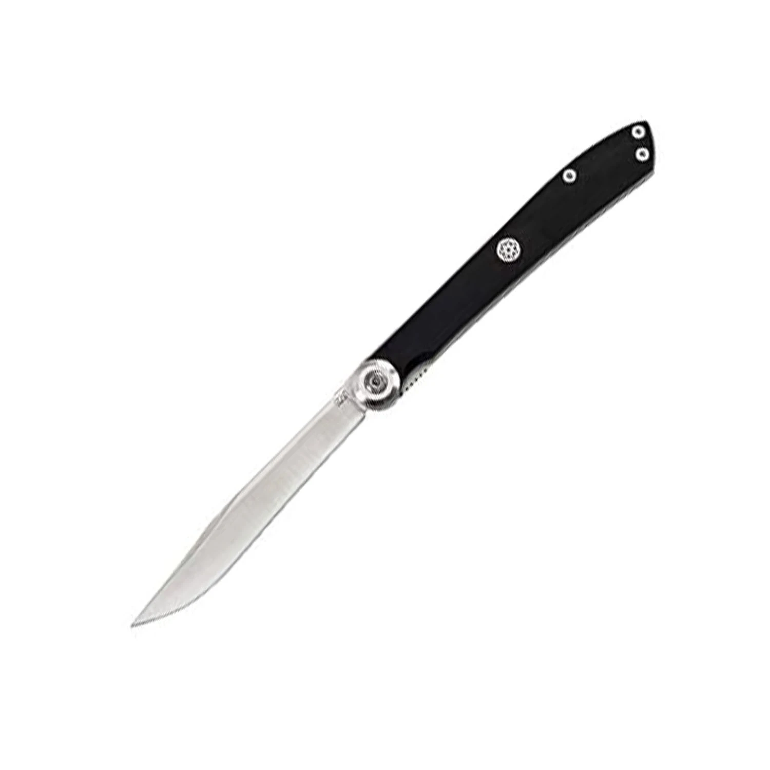 - Knife opens easily with a slim, elegant lever, but with no spring assist; features a secure liner lock, to ensure the blade stays safely open during use