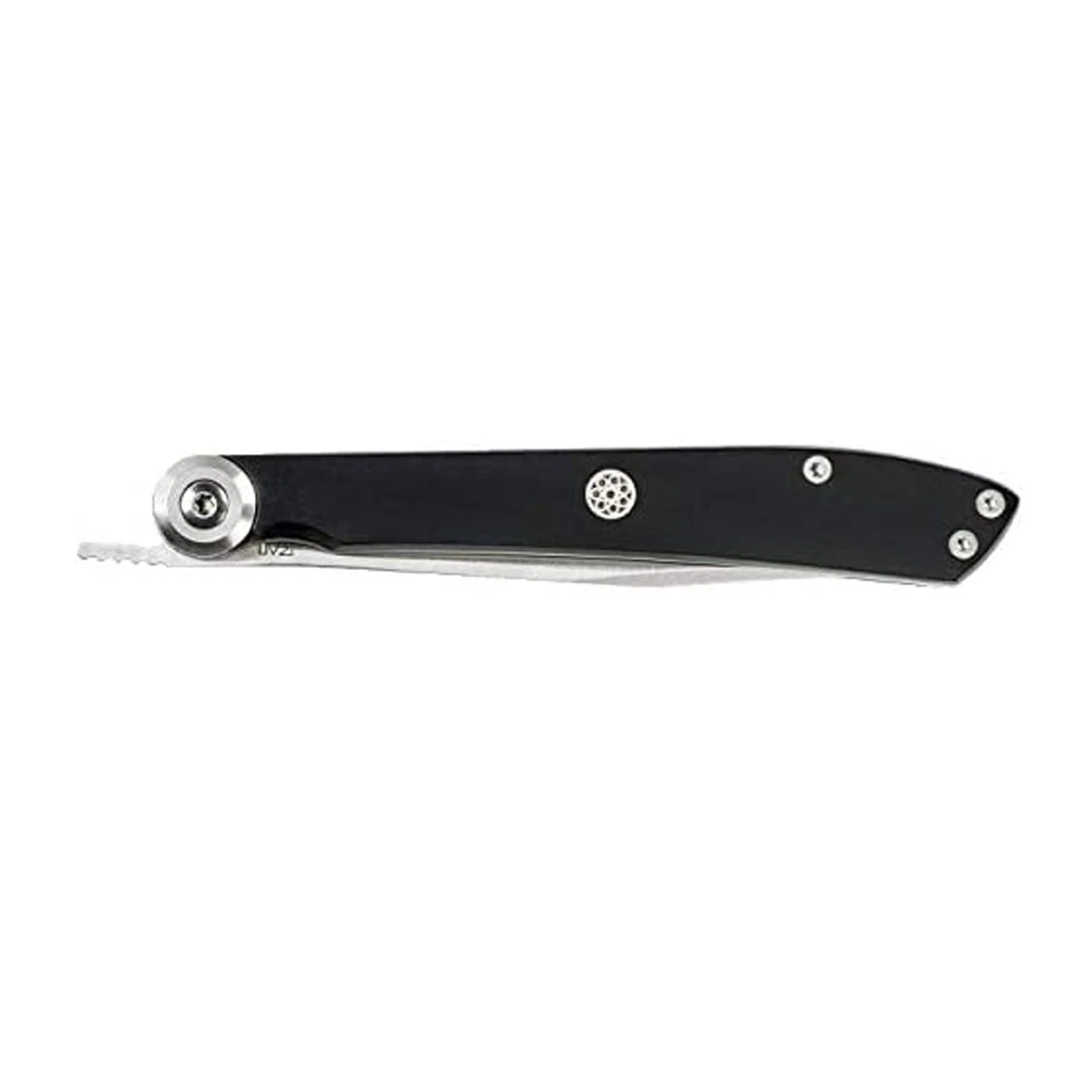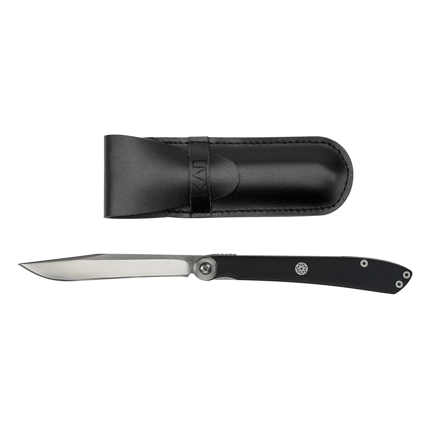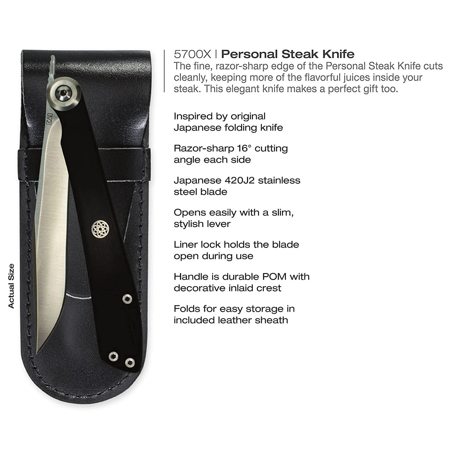 Never again find yourself at a restaurant struggling to cut your food with dull knife. The Kai Personal Steak Knife is razor sharp and folds compactly into a leather sheath to store discreetly in your pocket or purse. Based on the original Japanese-style folding pocketknife, the Kai Personal Steak knife opens easily with a slim, elegant lever, but with no spring assist. This ingenious knife features a secure liner lock, to ensure the blade stays safely open during use. Made with Japanese 420J2 stainless steel with a beautiful finish and a razor-sharp 16 Degree cutting angle each side, the Kai Personal Steak Knife glides through steaks like butter, without crushing or tearing the meat, causing flavorful juices to be lost. The handle is durable POM (a precision engineering thermoplastic) with a decorative inlaid crest. For easy storage, the knife folds to fit inside its own leather sheath.