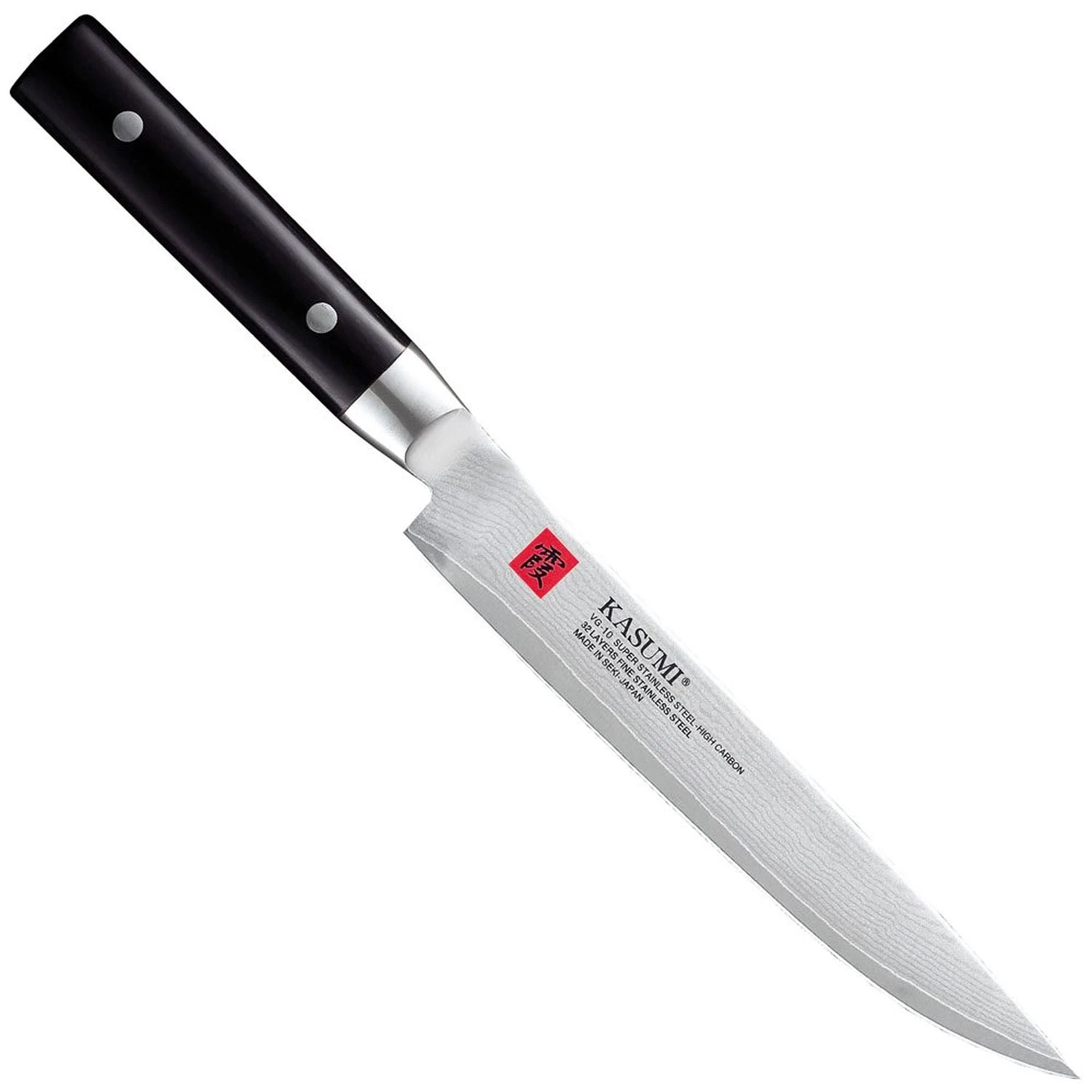 Kasumi knives are produced by Sumikama Cutlery in Seki, Japan. Sumikama Cutlery specializes in producing knives from the most advanced materials with the most advanced manufacturing techniques. Kasumi V-Gold No. 10 Damascus Pattern knives are made from 33 layers of stainless steel. Only the middle layer acts as the cutting edge, and it is made using V-Gold No. 10 stainless steel. V-Gold No. 10 is a high carbon stainless steel with cobalt, manganese, molybdenum and vanadium for added durability and ease of sharpening. The addition of cobalt to this steel requires special tempering in order to maximize the full benefit of this steel. Sumikama’s technique for this special tempering is a closely guarded secret.