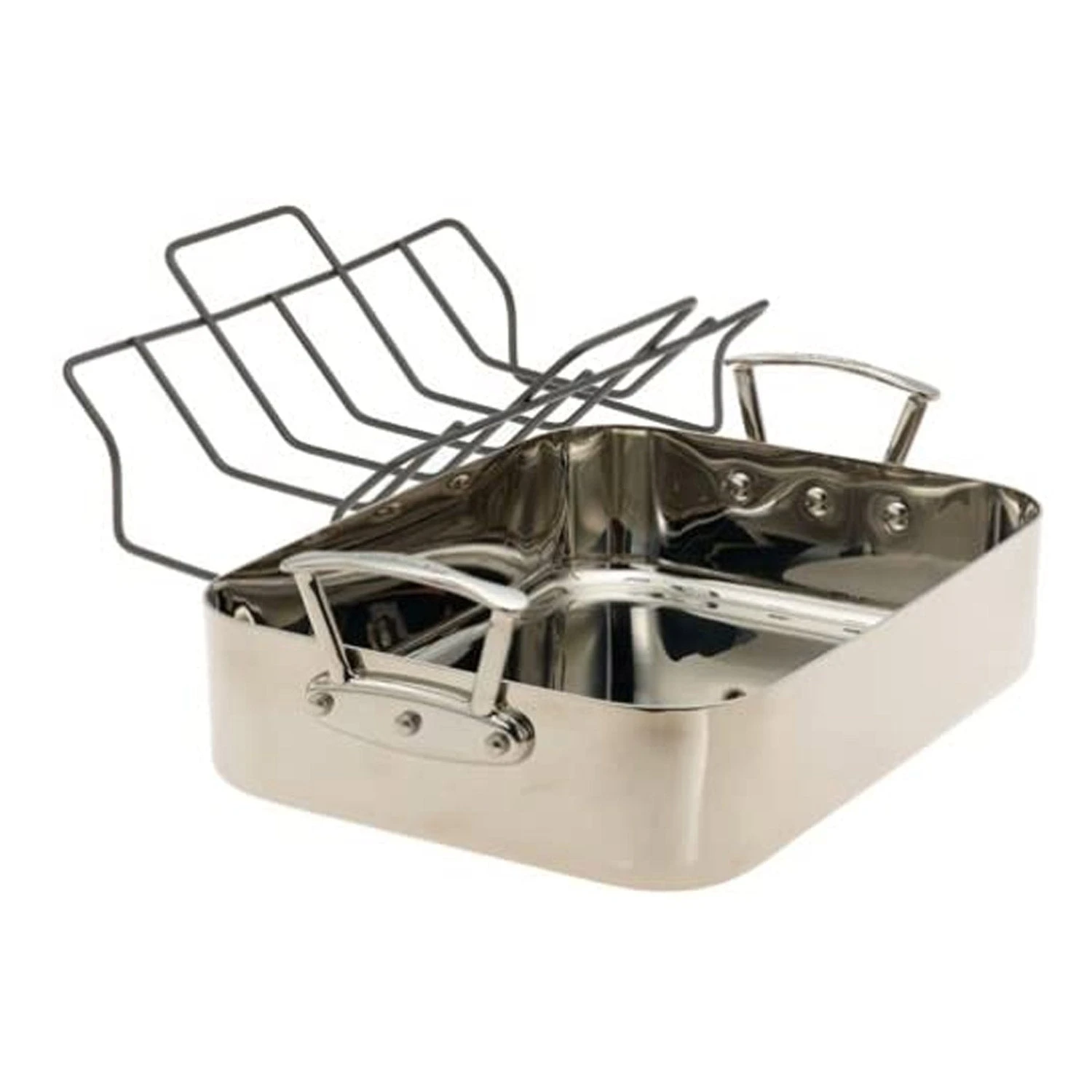 Exquisite-Piece you’ll want to take out and use often. Beautiful enough to go from the oven to your table. Made of 18/10 stainless steel for long lasting beauty and luster. Rack allows you to conveniently lift roast or turkey out of the pan.