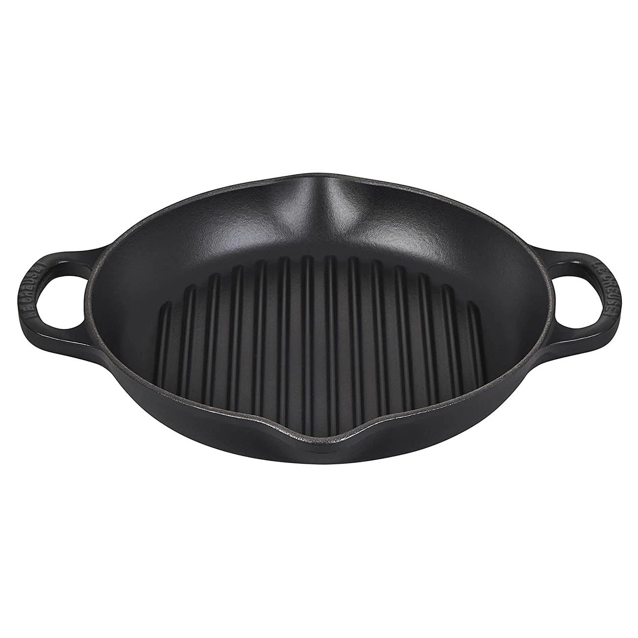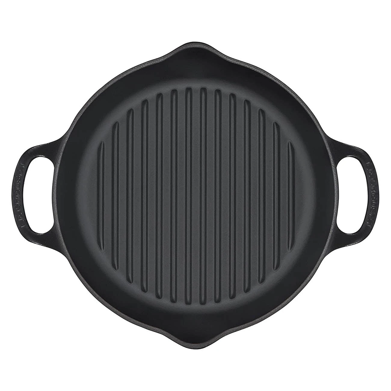 The Signature Deep, Round grill Pan gives all the delicious flavor of an outdoor grill, with all the convenience of indoor cooking. Closely spaced ridges provide more support for delicate food, like fish or vegetables, while allowing excess fat and grease to drain. The interior surface of a Le Creuset skillet is finished with a matte black enamel that eliminates the need for the traditional seasoning and maintenance of raw cast iron. Specially formulated for high surface temperature cooking, the enamel develops a natural patina over time that is ideal for searing, sauteing, and frying.