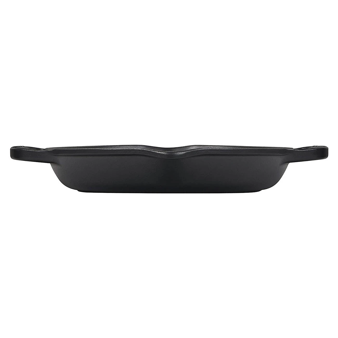 - Le Creuset’s durable black enamel finish means no seasoning is required