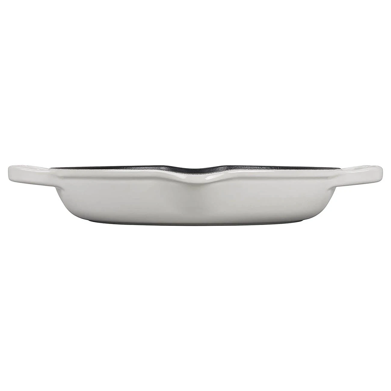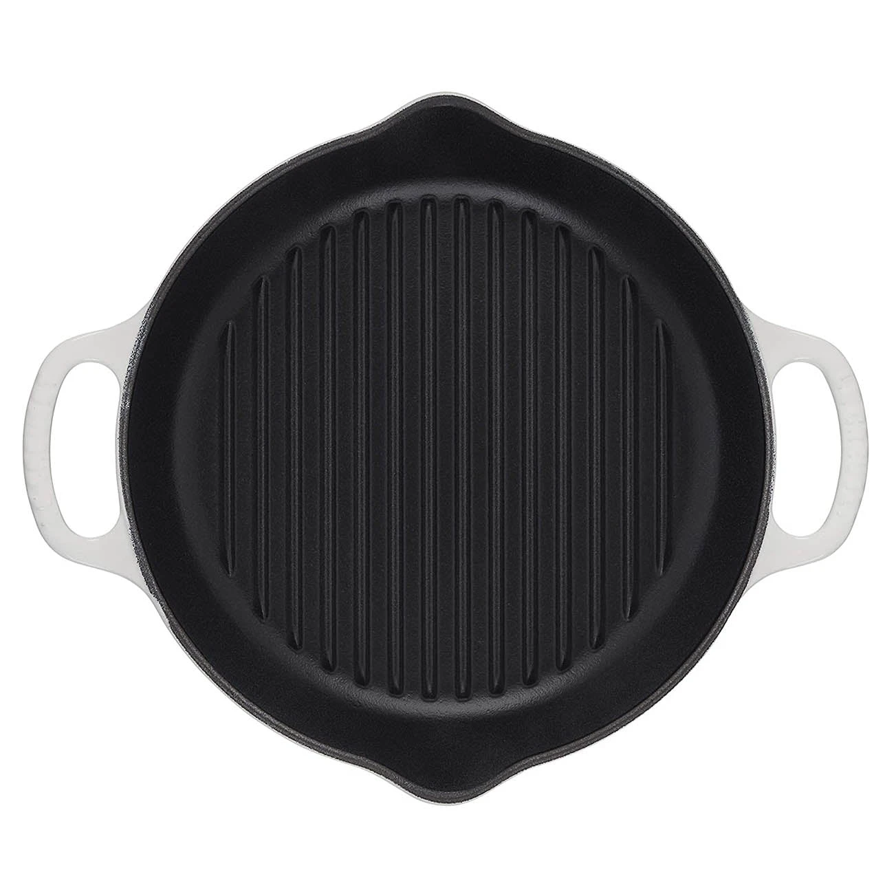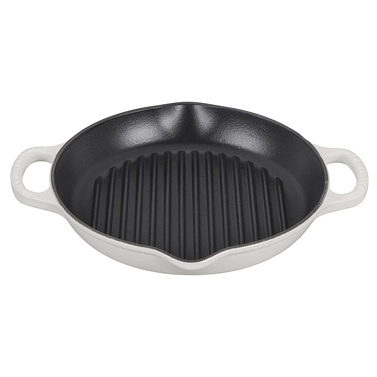 The Signature Deep, Round grill Pan gives all the delicious flavor of an outdoor grill, with all the convenience of indoor cooking. Closely spaced ridges provide more support for delicate food, like fish or vegetables, while allowing excess fat and grease to drain. The interior surface of a Le Creuset skillet is finished with a matte black enamel that eliminates the need for the traditional seasoning and maintenance of raw cast iron. Specially formulated for high surface temperature cooking, the enamel develops a natural patina over time that is ideal for searing, sauteing, and frying.