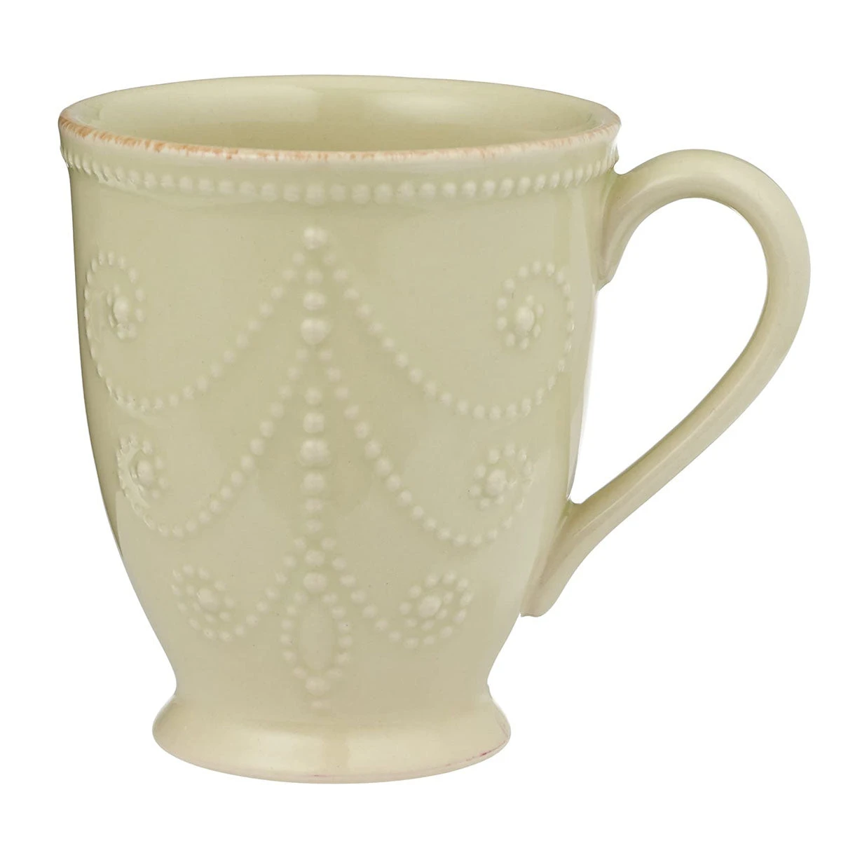 The beautifully beaded motif makes the French Perle Pistachio Mug casually elegant. The distressed tea-stain finish that encircles the rim gives this mug and dinnerware an antique look.