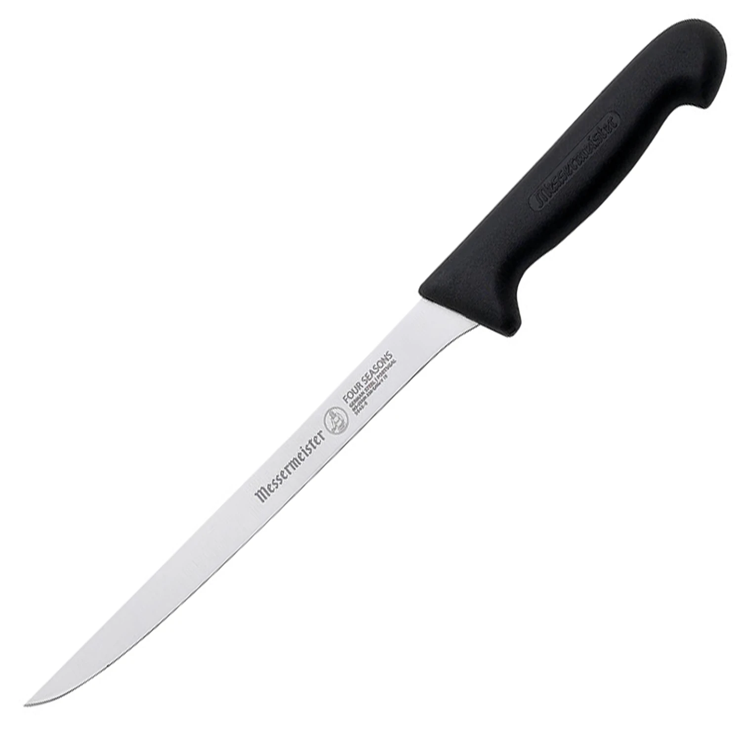 The Messermeister Four Seasons 8ā Flexible Fillet Knife has a stamped, flexible and narrow blade. Flexible fillet knives have blades that are extremely flexible allowing the blade to conform to the shape of the item that you are skinning, filleting or boning. Preferred by culinary professionals, this commercial quality knife is used to separate meat from the bone.