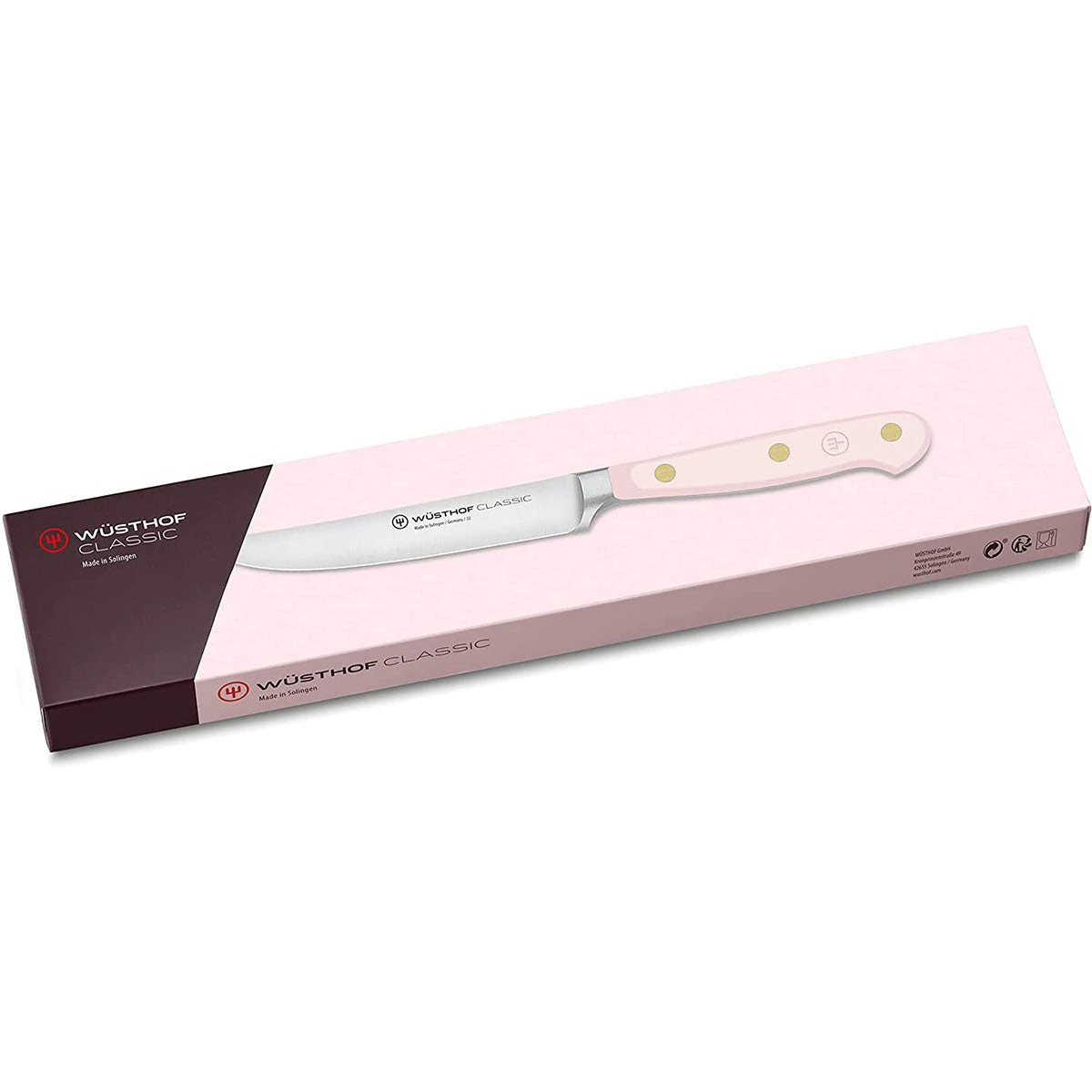 Forged from one piece of specially tempered high carbon steel to ensure outstanding strength with long-lasting, extreme sharpness. The WÜSTHOF Classic 4-Piece Steak Knife Set includes four (4) WÜSTHOF Classic 4 1/2″ Steak Knives. The Pink Himalayan Salt handles will bring a smile to your face every time you pull out your cutting board. Charming and delicate, these knives are for the simple-but-special things in life: slicing a sandwich to share or cutting into an anniversary dinner.