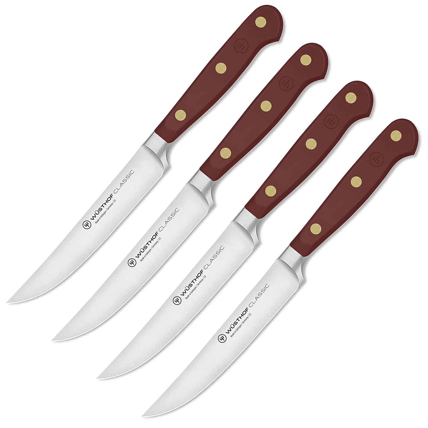 - WÜSTHOF STEAK KNIFE SET – Includes four 4.5″ Steak Knives. WÜSTHOF Steak Knives have a straight clean edge that glides through beef and other proteins like butter