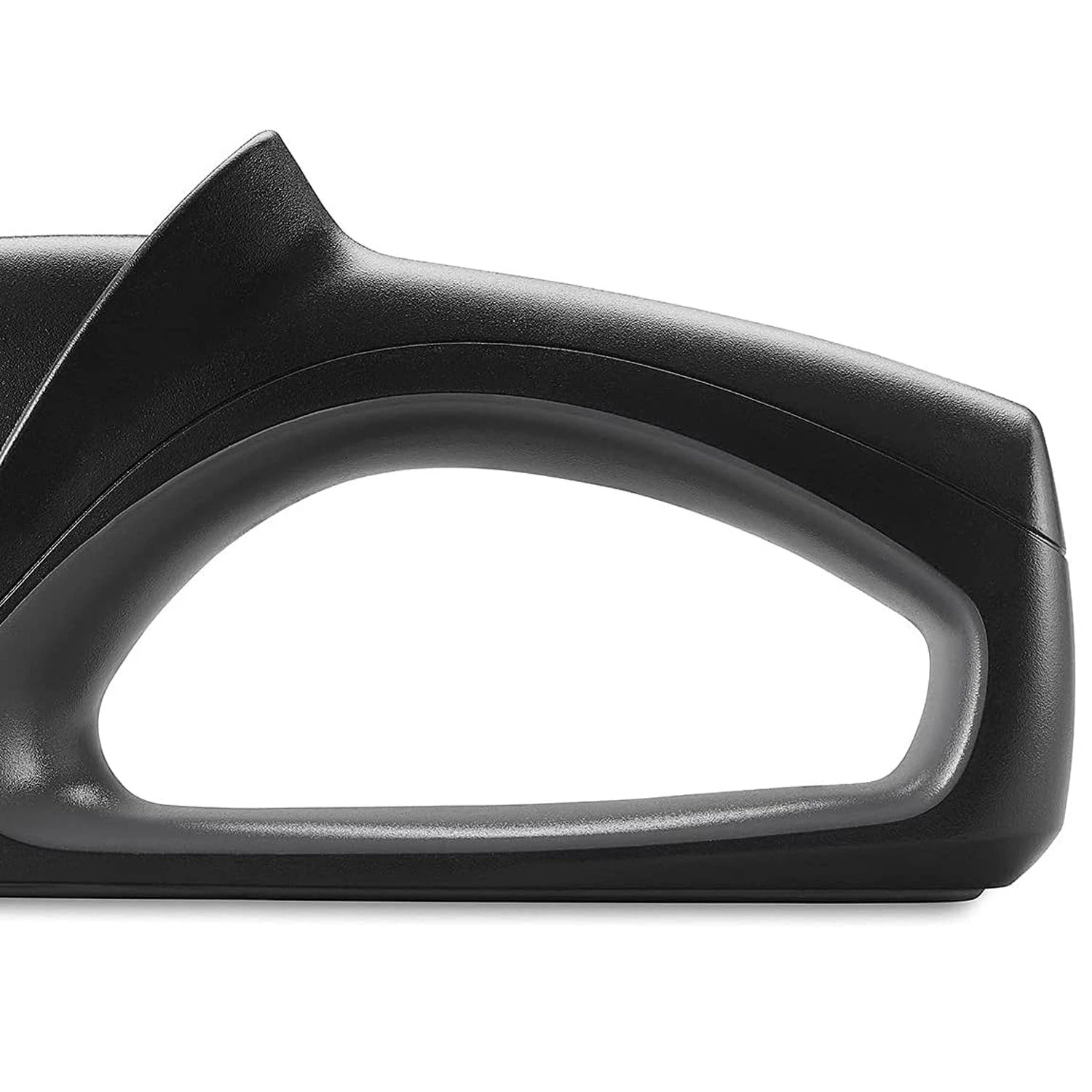 - PROPER USAGE – Place the sharpener on a flat work surface and hold the E-Z grip handle with one hand and the knife handle with the other. Insert the knife blade fully into the slot at a 90-degree angle to the sharpener and pull back a few times to sharpen. After setting the knife’s edge with the carbide side, use the unit’s ceramic side to nicely finish the edge.